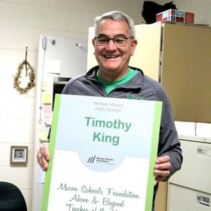 Mr. King exclaimed “MHS is a very exciting place!” and that receiving this award was a big surprise for him. However, it was not a surprise to anyone else! He shared, “Finding a teaching job in Mason has been one of the best things that has ever happened to me. This has been a great community and school district for as long as I have known it.”