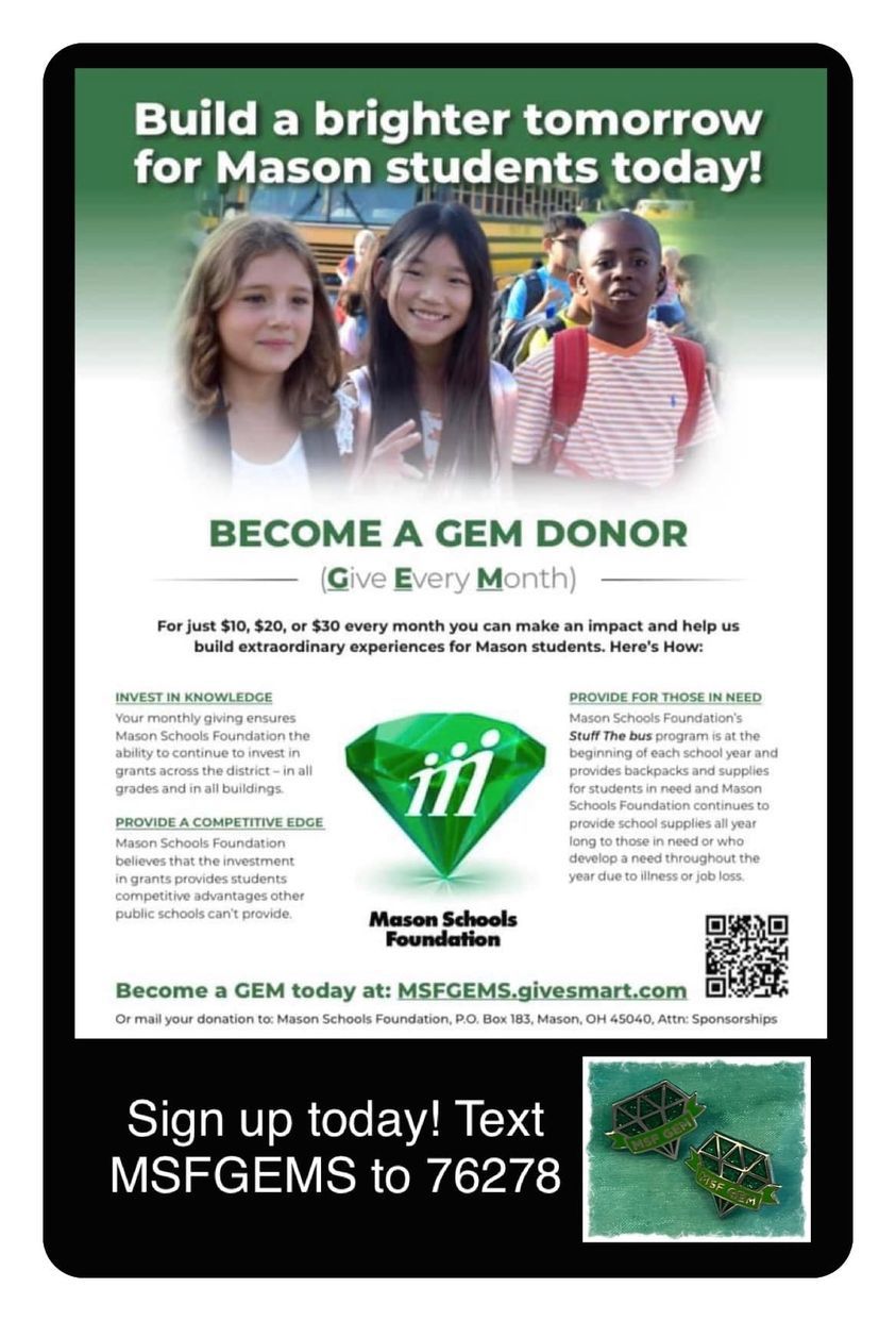 Did you know that for just $10, $20, $30 every month YOU can make an impact and help Mason Schools Foundation continue to build extraordinary educational experiences for ALL Mason City Schools students?!Sign up TODAY to Give Every Month and become a “NEWvember” GEM donor! Text MSFGEMS to 76287THANK YOU to our current GEM Donors. Your monthly giving ensures MSF the ability to continue to invest in grants across the district - in all grades and in all buildings. MSF GEMS:
